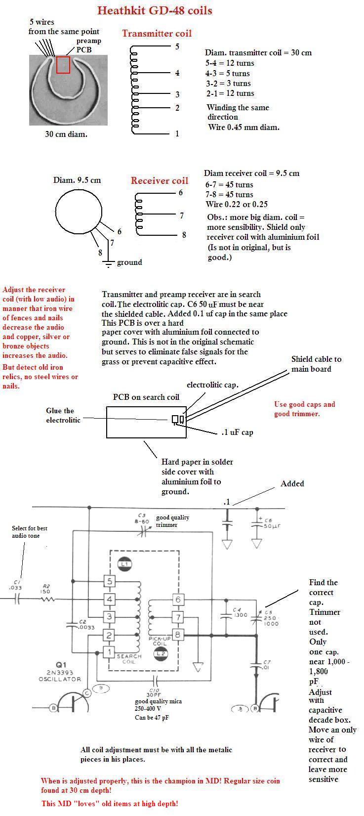 Hi I am wanting to re-produce a heathkit GD-48 from scratch and I need help only with the coil winding.it appears that the detecting coil has 5 taps which two are single wires and the other three appear to be stranded,my question is how do I wind this coil to get the stranded "taps" needed.also,what size wire would I use and how many turns?the diameter is 10"also the small pick up coil is tapped also,please tell me the proper procedure to wind this coil,and where can I get the coil material? thanks Lloyd