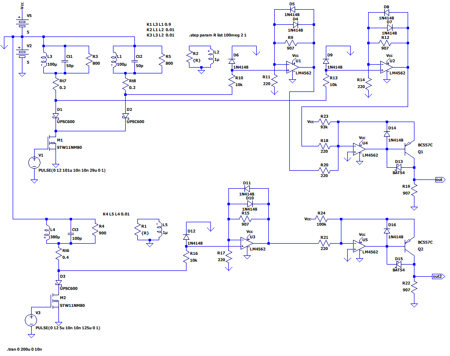 In the simulation the damping resistors have been adjusted manually. The upper half of the circuit is the split driver followed by two separate preamplifiers whose outputs are passed to an adder/level-shifter to refer the output to ground. The lower half is the mono coil. I assumed the coupling between the target and each split coil is the same as the coupling between the target and the mono coil.