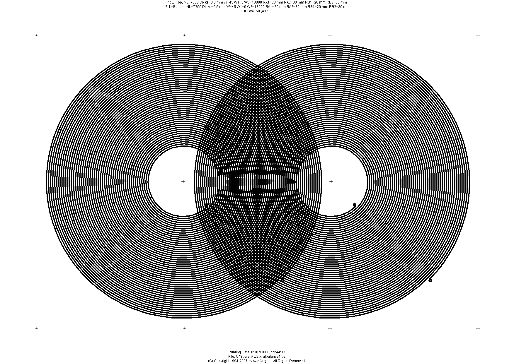 The spiral coil has a starting radius (20 mm in this example) and an ending radius (80 mm in this example) with 50 windings.