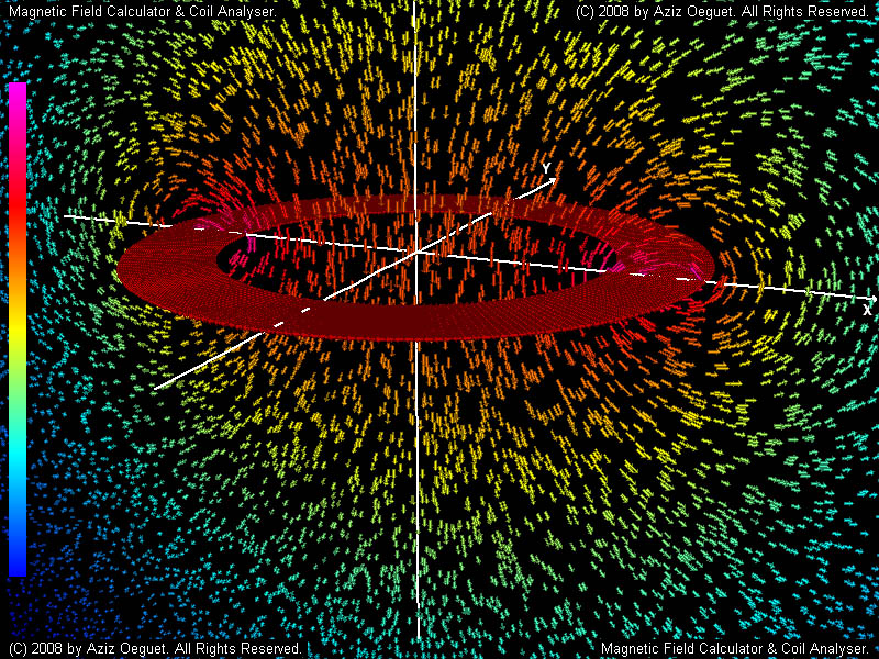 Figure below shows the magnetic fields strength and directions on a half cross section of the coil. Red elements are the coil wire elements with showing the current direction. Black vectors are magnetic fields (H-Field).