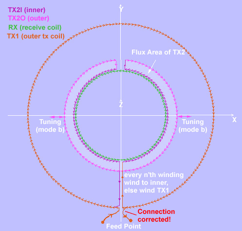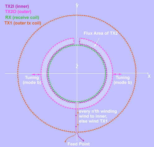 Aziz, as you say, it is possible that coil can not be nulled, although i am not sure in that. Namely only half of tunning/nulling loop act in opposite direction to outer TX coil, but this is the same in omega coil and there even by full number of TX turns (here only 1/4 to 1/3 of TX turns). On other site, construction of tunning loop is someway "self nulling", influence of this factor i expect to see on EM field presentation in your bright development. Nulling perform during to put near and away of both tunning loop legs.
