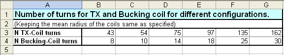 For all, who wants to experiment on different coil configuration, look at the table below. Keep the mean diameter of the coils as specified and take the number of windings for TX and Bucking coil as needed. Tolerance: +- 1-2 turns.