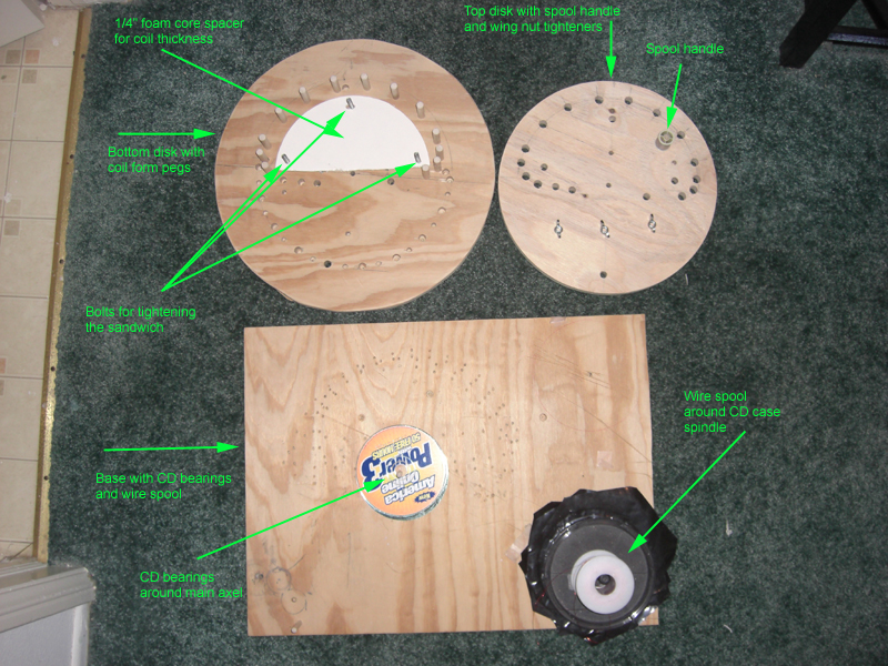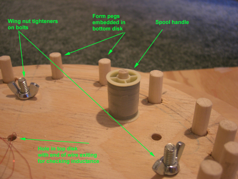 Inspired by dfbowers coil making, I've added a top disk to my coil winder to make a "sandwich" which squeezes the coil into a thin space while winding.