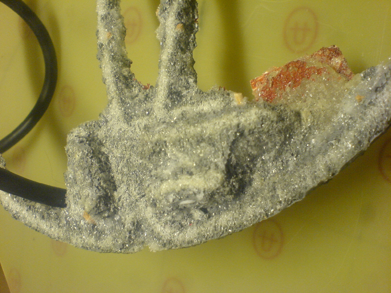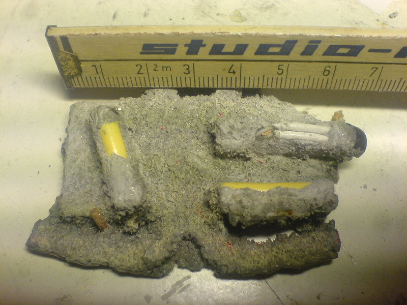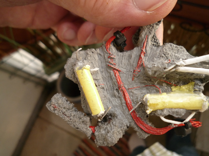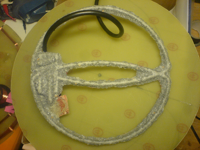- The epoxy or urethane compound seems to have been mixed up with some metallic powder, either Aluminium or Zinc. The compound is greyish and when cut, there appear some tiny shiny dots on the cut surface. Maybe a kind of shielding. One of the ground wires was directly inserted into this epoxy/urethane compound.