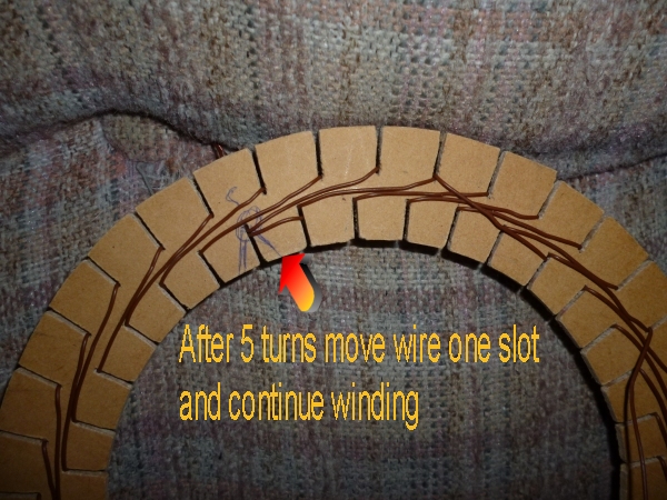 Now here is the trick to making this coil, after 5 turns the wire will fill the same slot from where you started, move the wire one slot and continue winding another 5 turns and then move the wire one slot and continue , you should not have any parallel wires, and the wire should stack up in the slots.