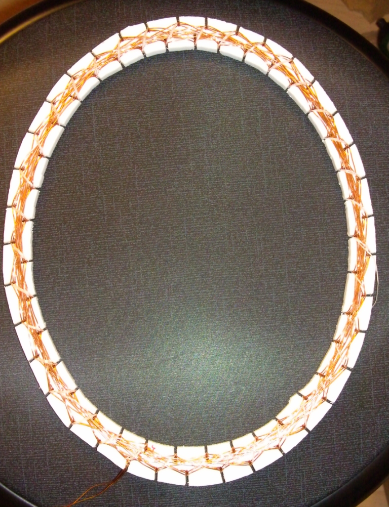 • "Racetrack" refers only to the shape of two parallel sides with two half circle ends. It is the generally the same image as in post 134 of this thread but with .5" inner slot depth and made of LEXAN. The wind is the same self shielding 'spider coil' wind you and I have done in circular coils and by the way this coil does not see my hand fully grasping it.