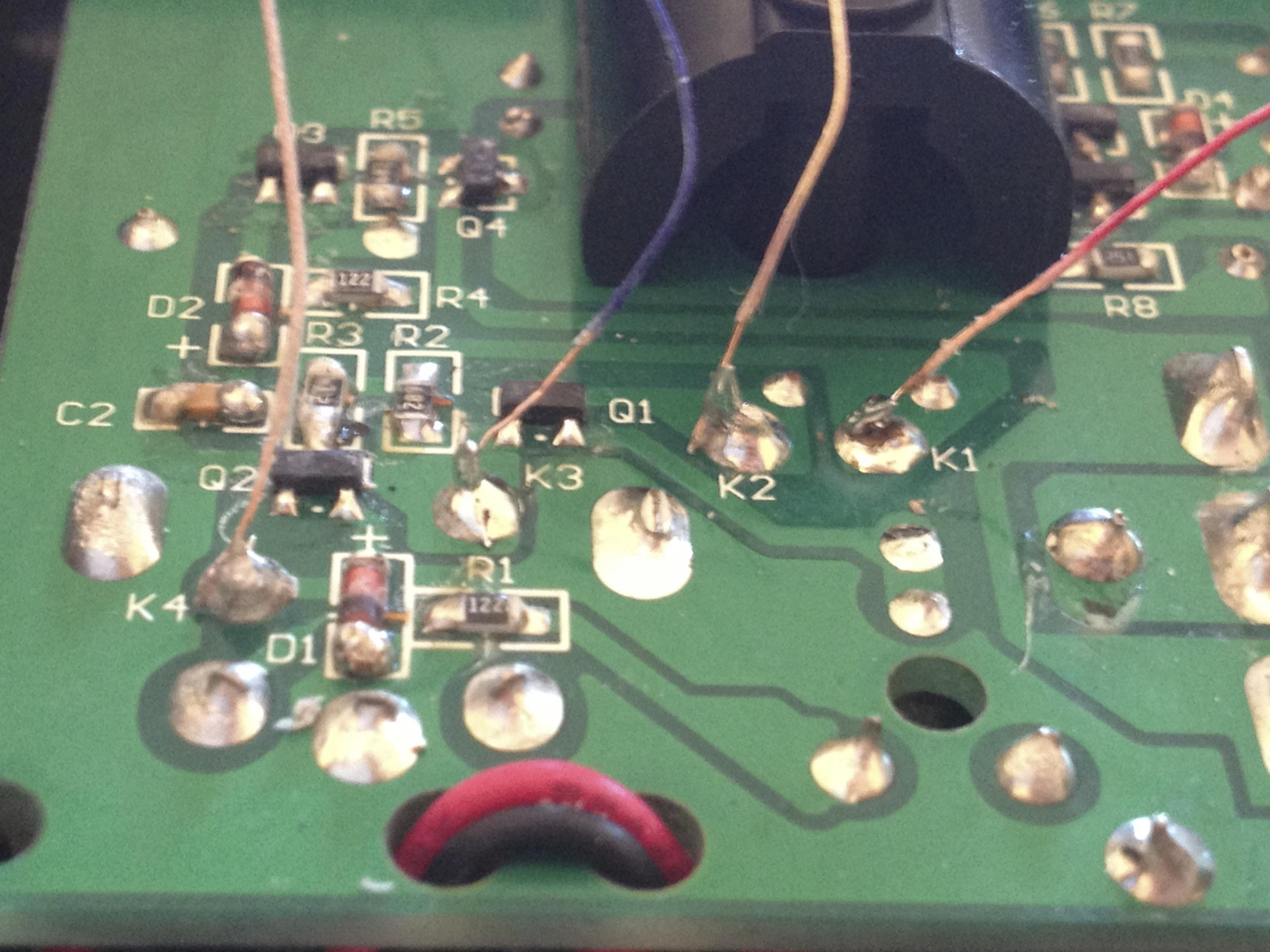 This is the board for the V2, I have found a pic that's not real clear but clear enough to see, K1 to red, K2 to yellow, K3 to blue and K4 to clear or plain coated wire. Thanks for your reply. I can't get the pointer to stop sounding even on the lowest sensitivity, I'm going to try the adjustment under the belt clip. I also like the idea of the lead ring around the wand, placing in between alarm and silent by sliding the ring forward from the base.