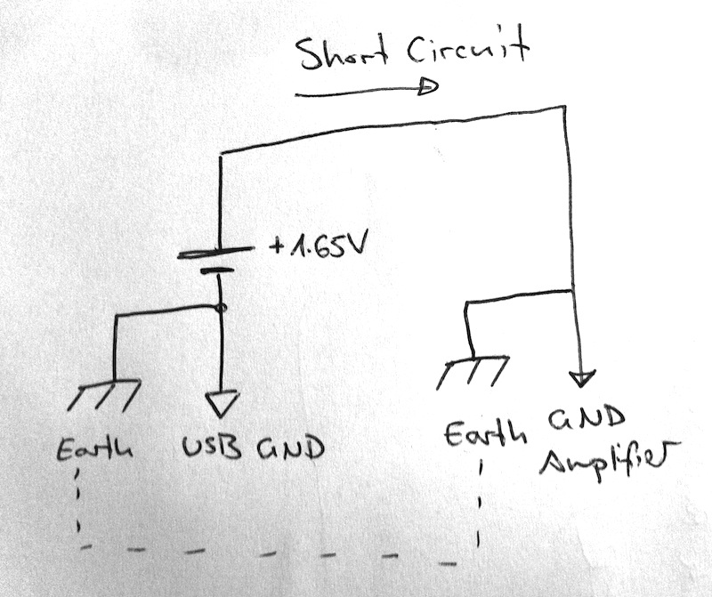 Now I have my amplifier board that has its own power supply, and usually you connect the grounds of the sound card with the ground on your amplifier board through the sleeve of the audio jack. But I'm not quite sure if I can do that because the ground of the audio jack is not the real ground on the sound card - it's a virtual ground at 1.65V.