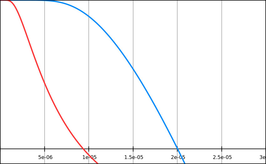 Let's take, for example, two pulses T1 = 100us and T2= 400us. We want k to be at least 1.1 (10% away from 1 in order to solve the above system of equations). The minimum value of t (sampling delay) can be calculated from this formula: