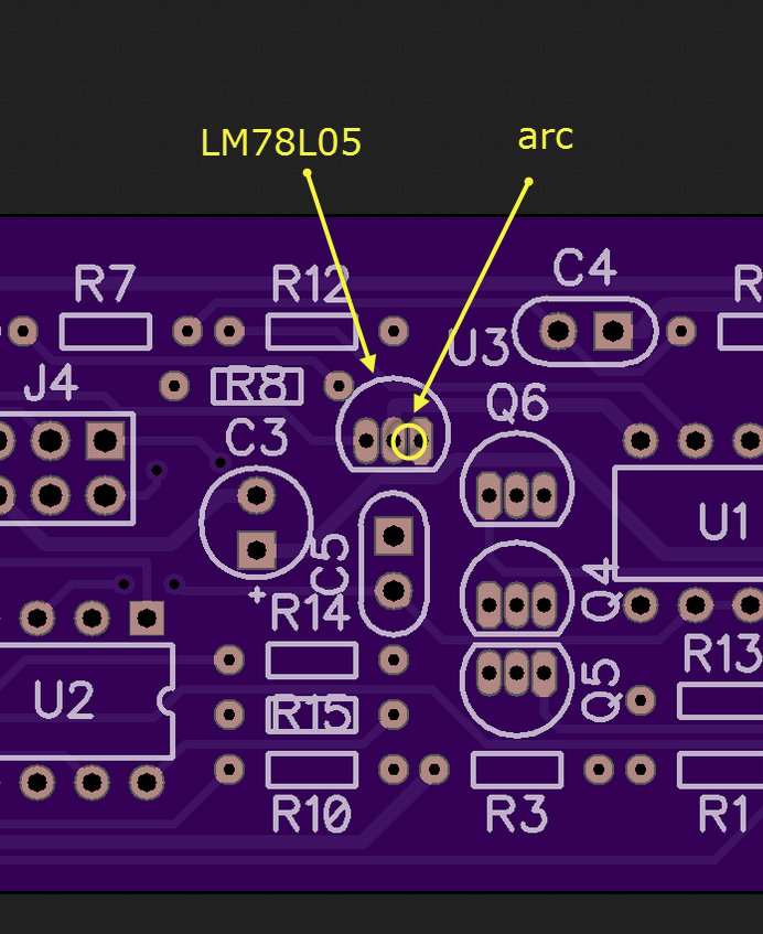 I soldered all the components and the circuit worls as expected... but ... occasionally I get arcing between the ouput of the LM78L05 and its ground terminal. It happens at random, the LM78L05 heats up with no catastrophic failure, then the circuit returns to normal. The input voltage is a mere 7.5V.