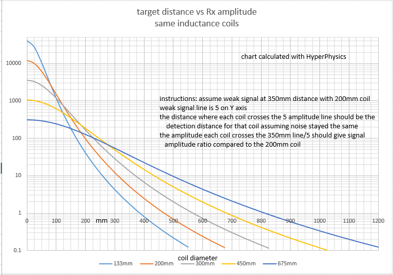 A chart I posted awhile back. Didn't chart your coil size but if you look at 133mm detection distance for the 133mm coil going larger adds a small amount in distance. Noise would also increase so I'm guessing detection distance wouldn't change much for targets you can just detect at your coil diameter. You could try a coil twice the diameter .7 times the turns and see. I'm just guessing, maybe someone that knows could reply.Originally posted by Teleno View PostYou're correct. I've repeated the test holding the nuggets with a wooden stick and it works just the same.