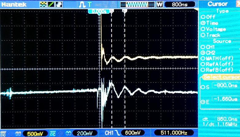 The ripple is the same regardless of the coil. Its frequency is 1.16 MHz and it decays in about 4us.