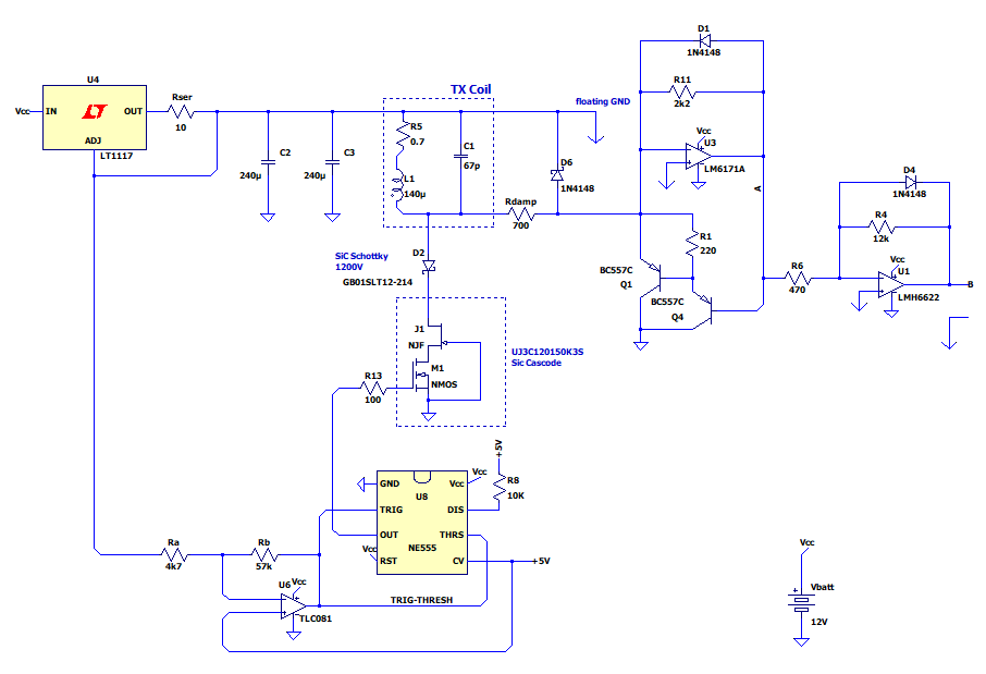 The op amps chosen are both low noise, high bandwith and slew rate. The LMH6622 has the largest BW (160 MHz), the LM6171 as a huge slew rate of 3600V/us. I should probably switch their positions as the 2nd and 1st stage, respectively, but then the BW of the LMH6622 would have to be limited or else the 12MHz oscillations would get much more amplified burying the signal.