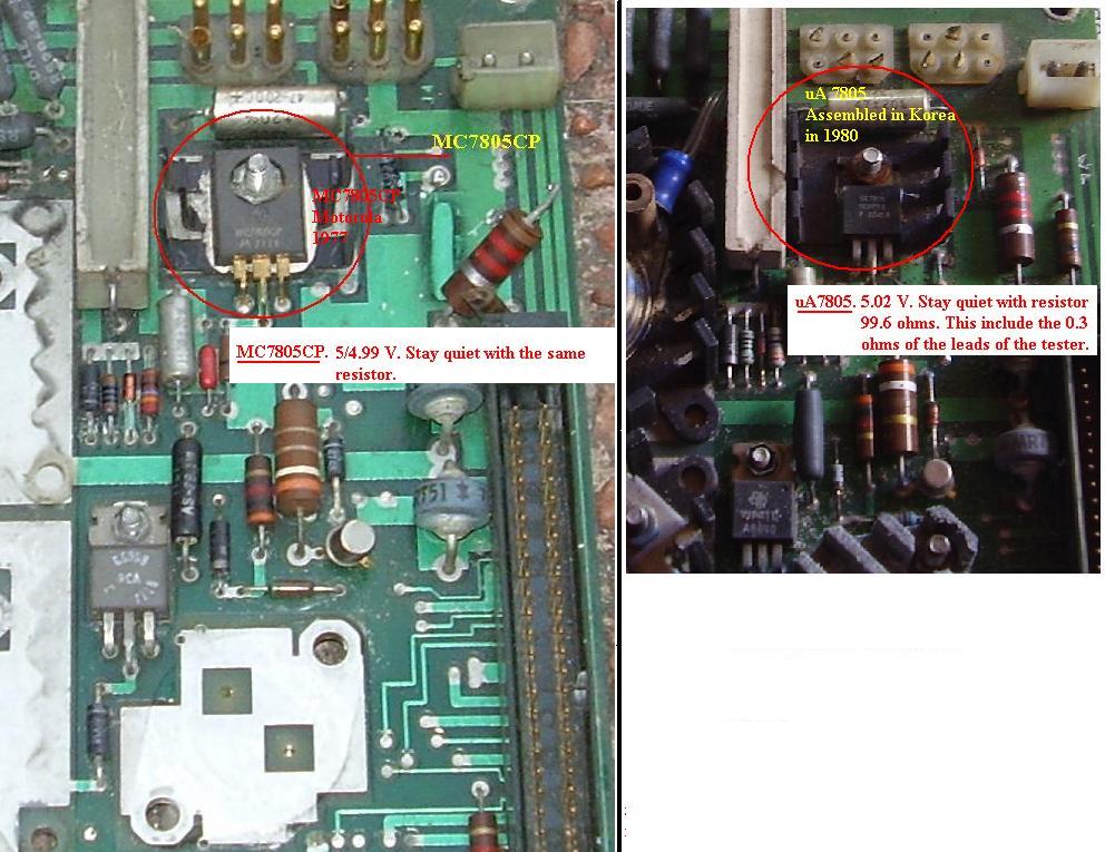 Here photo of 2 equal equipments. One uses the Motorola MC7805CP and the other is marked as uA 7805, manufactured