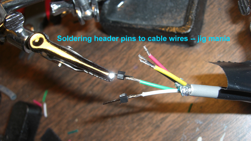 P.S. I loathe alligator clips that won't bite a wire because of gaps. I'm also not fond of these cheap solder jigs with two arms with alligators -- they are a pain to line up. We need jigs where each side holds something at a given orientation and height, and you can slide the two sides together on a track. Anyway...
