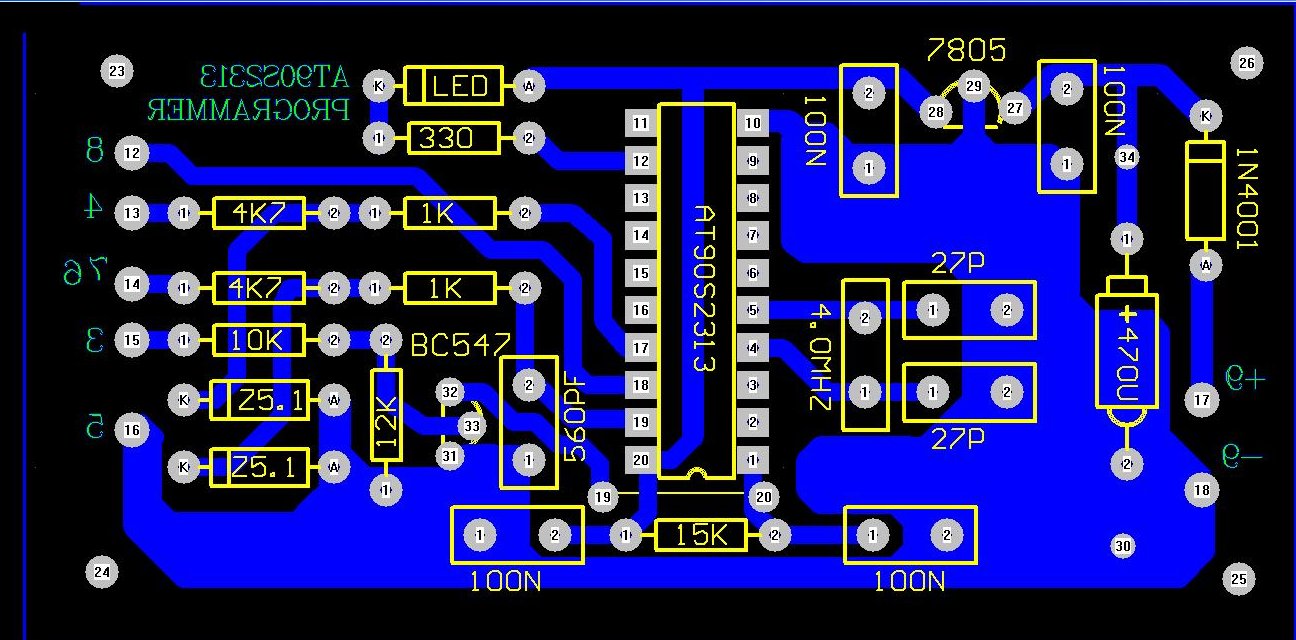 Some years ago I made a little pcb for programming the 90S2313, it is some sort ISP programming. The info for it I found on internet.( can not find it now..) Connect it to the com port from a pc and use ponyprog as software. As power a 9 volt batt. is used. There can be better ways.... but it works.