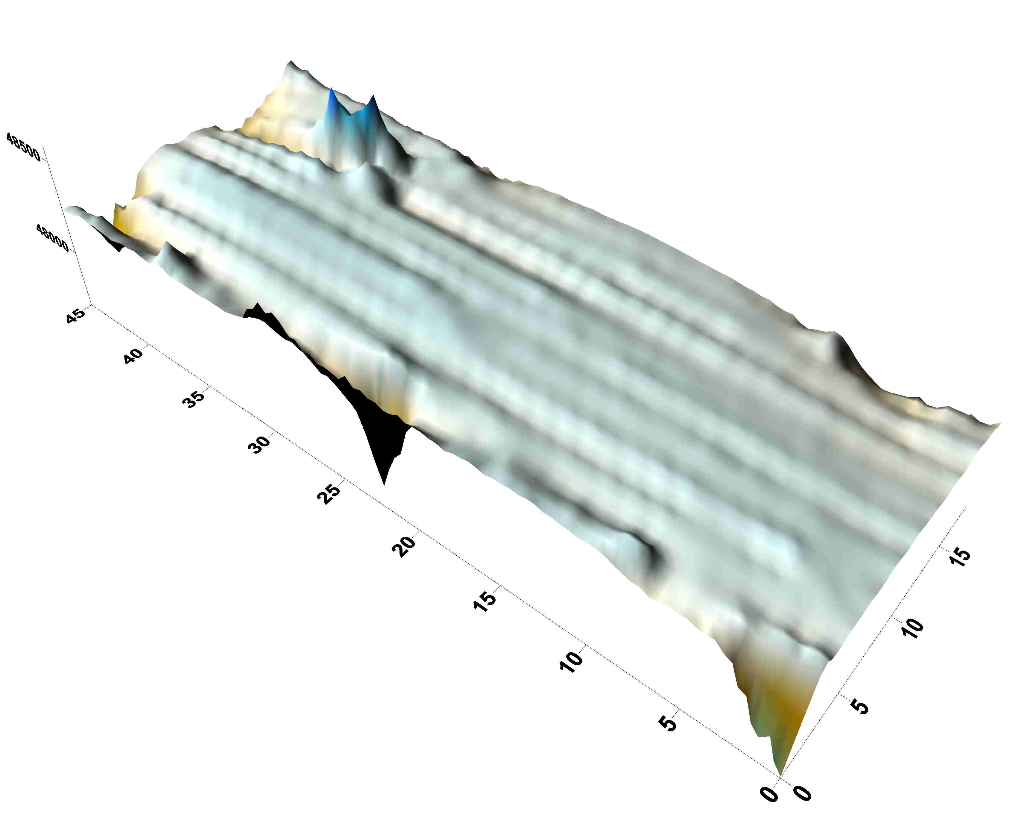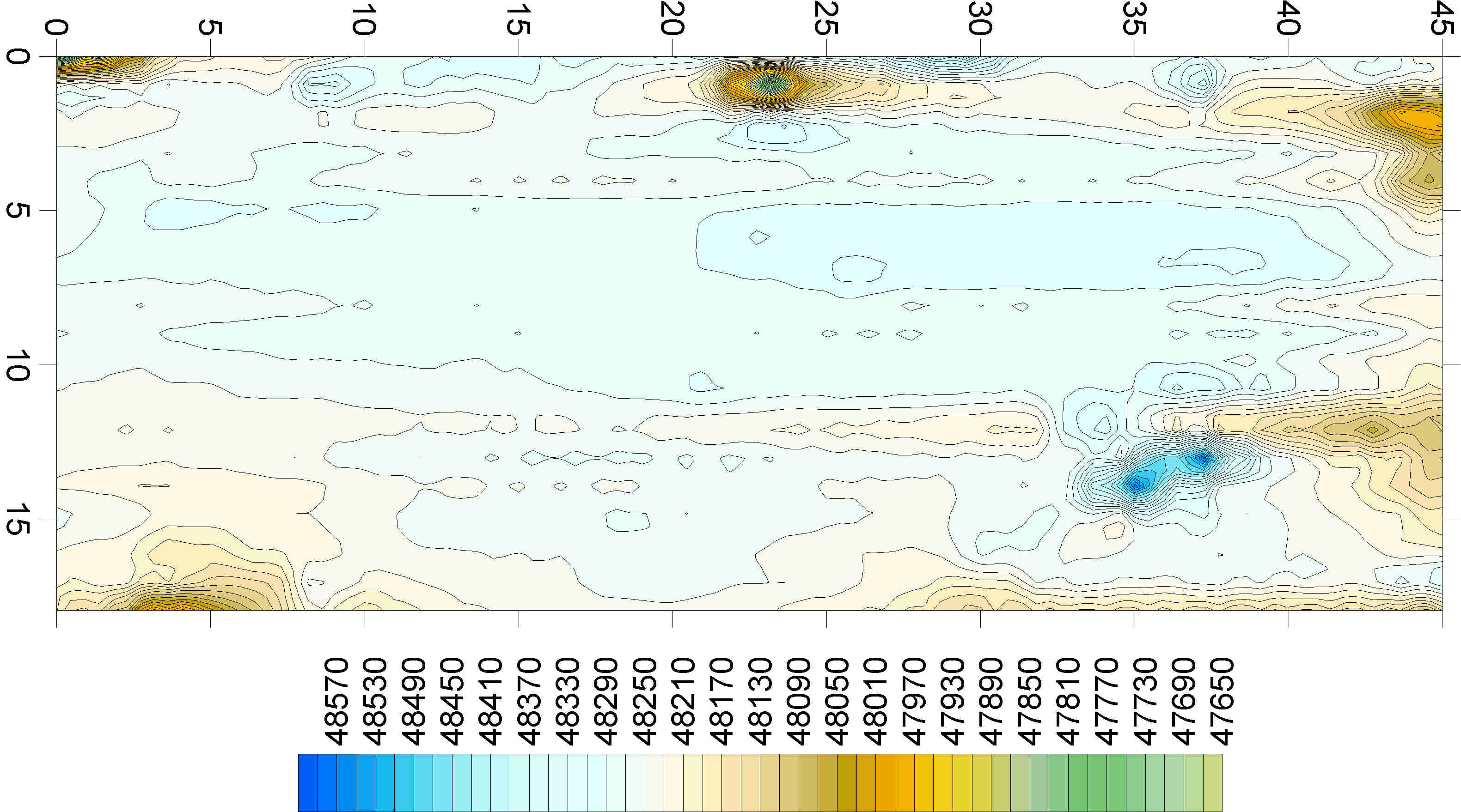 You can clearly see the negative gradients around the survey area which are indications of fences or buried elements of fences but the structure in the middle (around 13,35) is not ferrous (it is a positive gradient while ferrous material makes it negative). We'll make some vertical digging or drilling later on to check what's there.