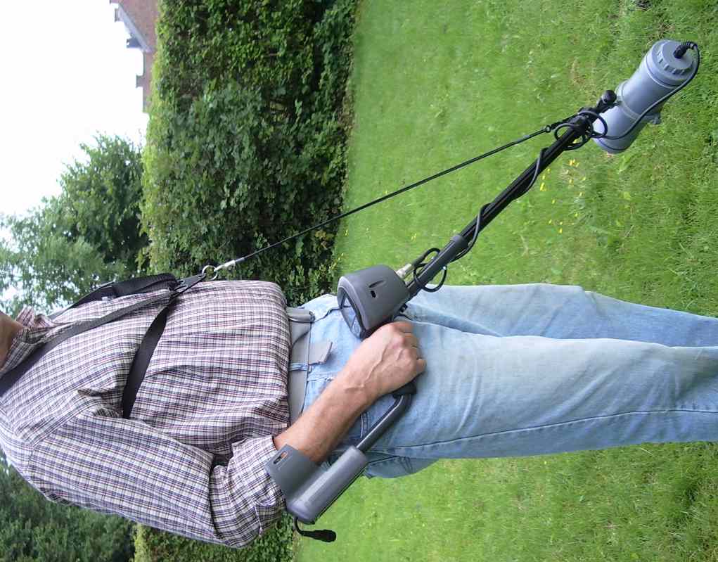 Another method to carry a PPM is the one I currently use in my own surveys with a prototype of our system. I have used a long stick (two meters) of aluminum horizontally carried with a shoulder-attached belt. The sensor is fixed at the forward end of the stick and the 12V Gel-cel battery fixed at the back end as counter-weight as it has abouth th esame weight as the sensor. In my own experience, this enables an operator to easily and comfortably carry an heavier sensor during long survey sessions.