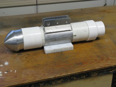 We have found that it is not really necessary to make the complete fish as a pressure-protected ccntainer. We are designing a small container with its dimensions selected to fit our sensor coils in in-line configuration. It is built from a section of high-pressure PVC pipe (90mm outside diameter, 7mm thick walls) closed with two machined caps each with double O-rings. The cable goes through an IP68-rated connector guaranteed to support 100m depth for several hours. The sensor container just needs to be inserted inside a fish made of simple PVC pipe with a nose and fins on which the lead weights and the towing cable have to be fixed.