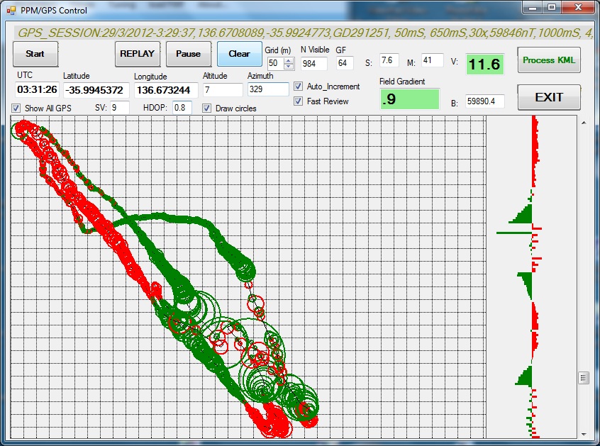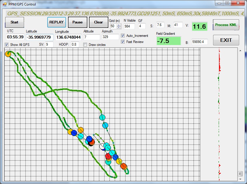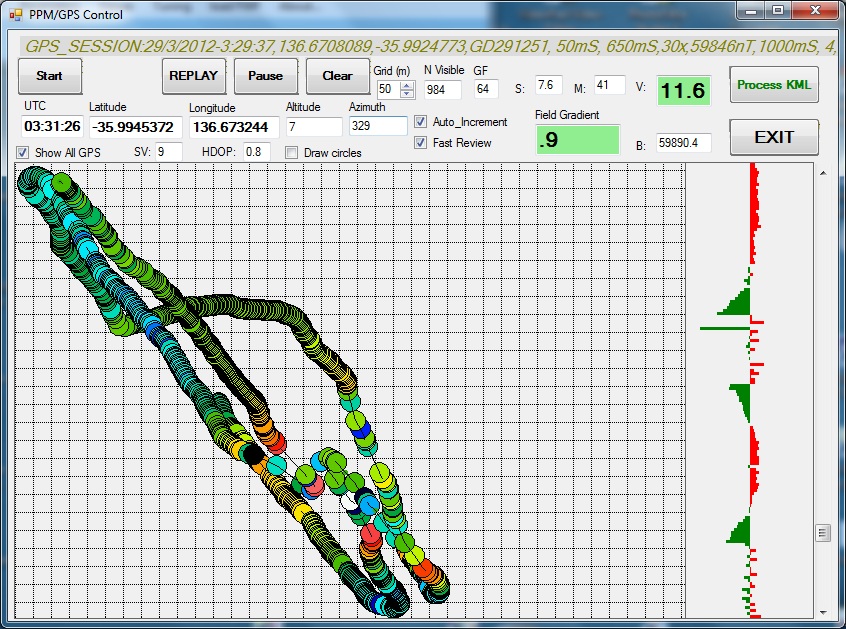 b. We have written a Windows-based PPM/GPS multiplexing program which receives the PPM data stream from one of its COM port, receives the GPS NMEA0183 data stream from any external GPS device through another COM port, merges the two streams into one single survey line per second and stores it into a file on the laptop. As a further option, the program can also re-emit the NMEA stream to a third COM port to feed a GPS-supported GIS program to show the boat survey path on a geographical map. As the current laptops do not support any RS232 port any longer, the COM ports are simulated by small (and cheap) USB/RS232 converter boxes.