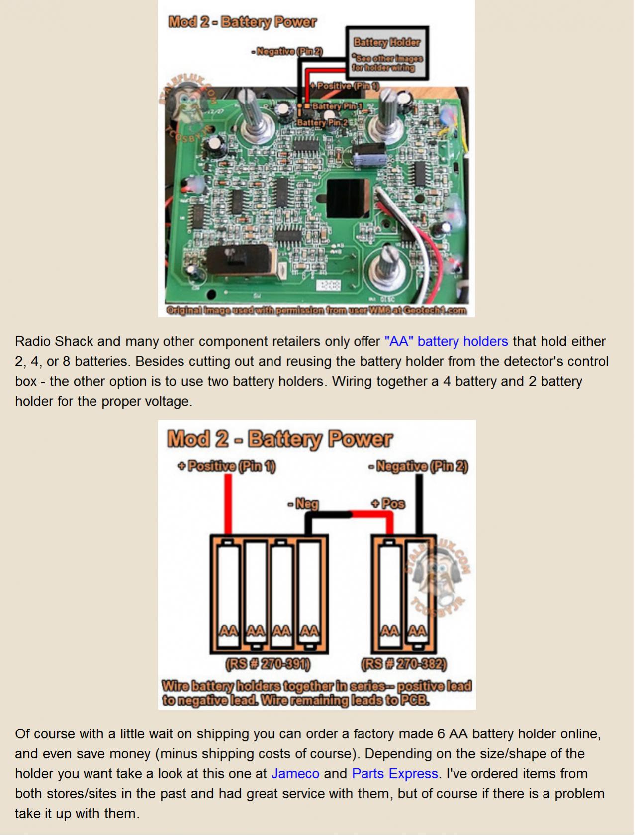 - Battery tray is water resistant, has a simple latch to allow easy battery changes when detecting, and holds three 9V batteries for longer detecting time. Also this allows me to continue detecting even if I only have a single 9V battery as only one is required to power the detector.