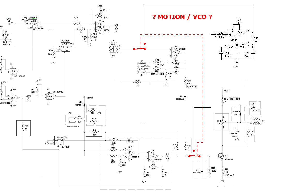 But I'd like to keep the original a scheme of SurfPi, so that the on/off switch can choose whether to operate normally, or VCO mode - using the existing potentiometer (for threshold and gain) and the original surfpi audio output stage.