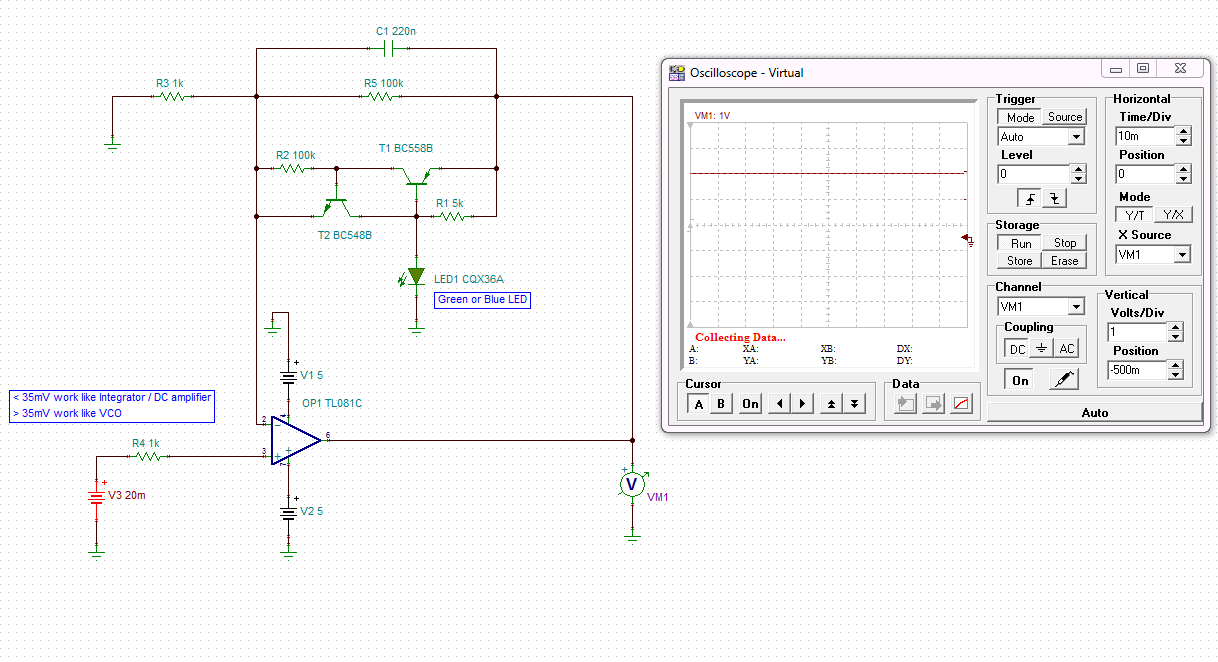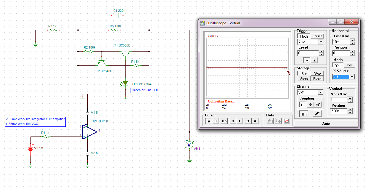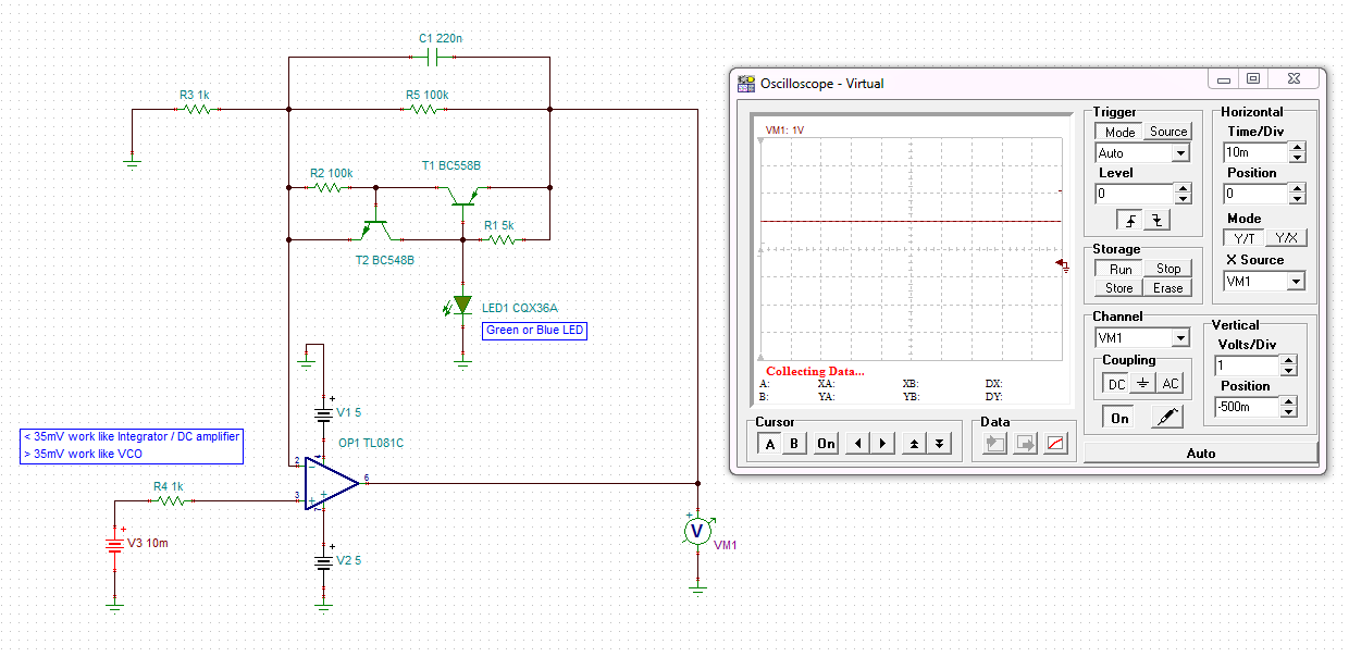 Note that at an input voltage of 55 mV, the original circuit should already enter in useless saturation mode but instead it switches and operates as VCO
