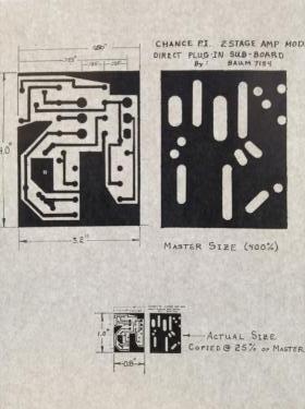 Attached below is a PDF of the scanned artwork mask for iron-on heat transfer to a .8" X 1.0" double sided PC board. When completed this will result in a direct plug in 2 stage amp for the CHANCE PI detector. The larger images in the PDF can be sized to 3.2"X4.0" and can be printed at 25% to yield the 0.8" X 1.0" size.