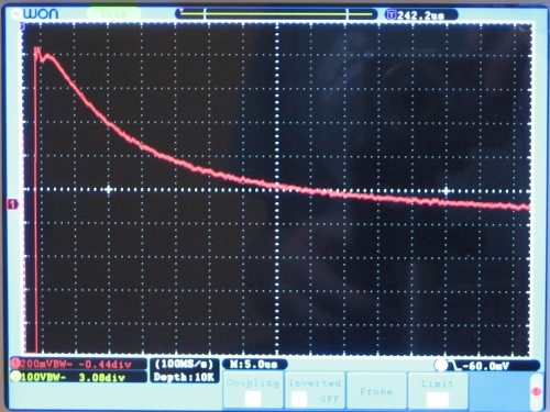 I just took a few pictures today, of the response of different targets. The opamp is SSM2019 and the gain is 10. Since I have the circuit on the breadboard I can also take pictures of the signal before the amplification, if it is any help.Originally posted by Beenthereuk View PostMy circuit did not work because the integrator period is too short - I realise now having analysed the simplepi circuit that has a response to the pulse that is over 300 uS long.