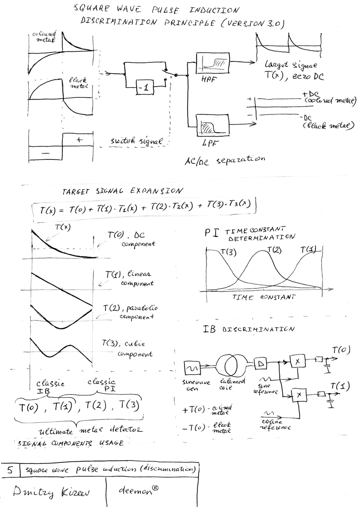 . As I had shown before , if we excite the target with this square wave pulse train - we can obtain the same exponential decaying target response as we can get from a well familiar PI device . And what can those devices do ? In the simplest PI machines ( with one sample pulse ) we can operate only in the "all-metal" mode , and cannot determine both the metal type ( ferric and non-ferric ) and the target TC too . When we add more samples , we can measure target TC more or less precisely , but a ferro-discrimination is still impossible . Using my terminology , I can say that those devices can utilize only the "highest" terms in the Taylor series of the target response function ( T(1)-T(3) ) , but without T(0) . If we take into account the fact that this T(0) signal depends on magnetic permeability of the objects near the coil ( as I explained before ) - we can easily understand why all PI machines does have a good "ground tolerance" . It's just because the ground has a ferromagnetic properties and might give a most strong reaction on the T(0) signal . But if the metal detector cannot receive it - it has very weak reaction to the ground , of course . And we must notice that the simplest PI device cannot separate T(1)-T(3) terms , receiving them "in general" , receiving only the sum of them , more or less effectively , and this is why they cannot distinguish a big piece of metal from the little one . But my new circuit ( VERSION 3.0 ) can do this and it can obtain the T(0) term also , so it can do the thing that PI device with mono-coil never did - I mean ferro-discrimination function . In another words , I can say that my device "includes" PI principle in it and all PI devices are a kind of "subset" of my device . It's become obvious if I "cut" my circuit , I can get a simple PI device with "all-metal" operation ( VERSION 1.0) , or a more complicated VERSION 2.0 ( see a block diagram in the post 29 of the topic ) , being equal to a PI device with a TC measuring possibility . And we can easily see that 1.0 version receives all the exponential decay in general ( as I explained in the post 34 ) , and the 2.0 version can "disassemble" this function and analyze its parts , measuring the target TC .