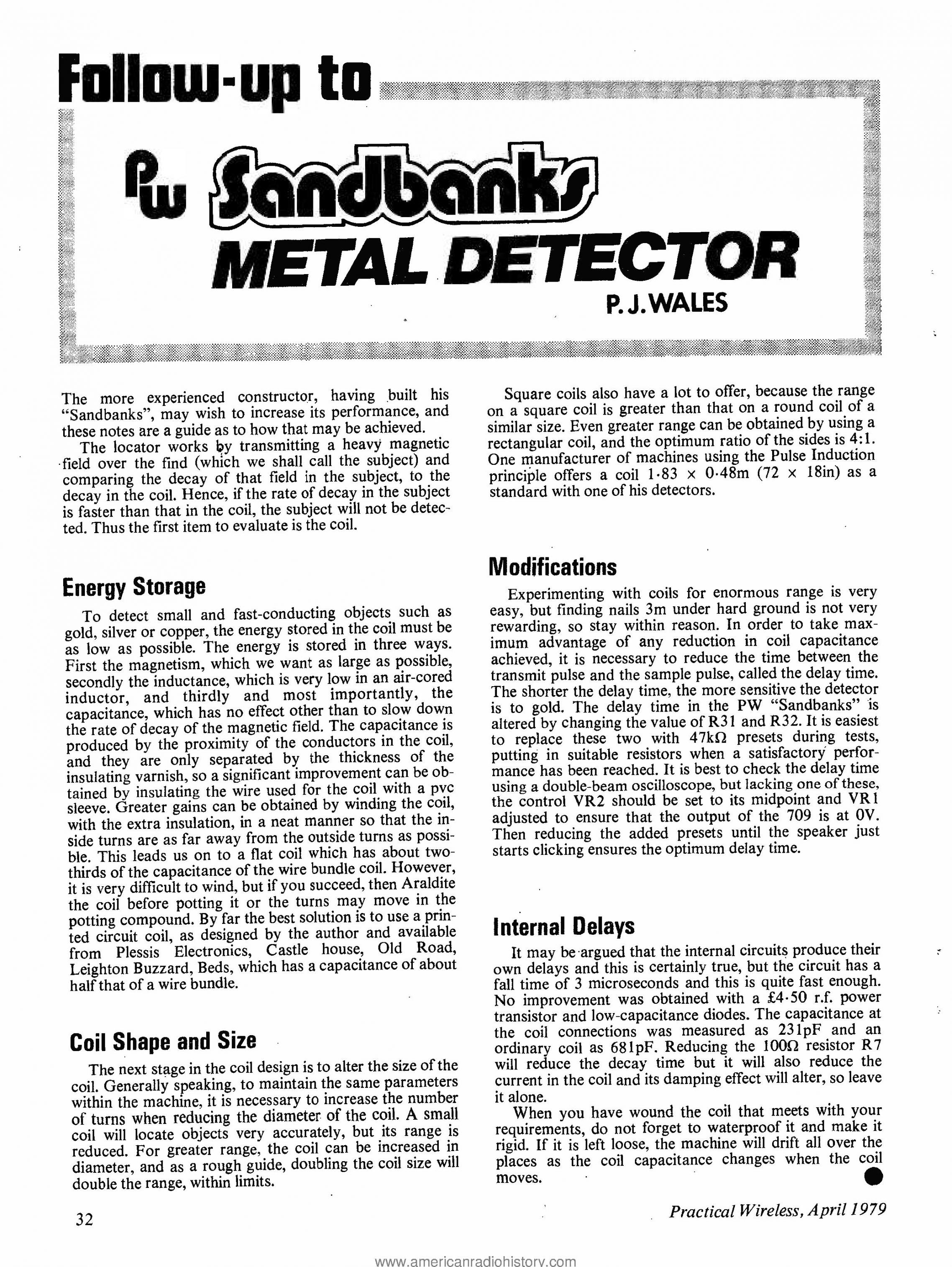 There is a follow up-article on the sanbanks project in a subsequent magazine, which discusses modifications to the original circuit. I post it here. The sandbanks I built works great, and goes deep on the beach sand. I built it entirely of salvaged components and I managed to alter the circuit for use with NE5534 chip instead of the old 709. The original circuit used T1 and IC3, a CMOS ring oscillator for the PS.