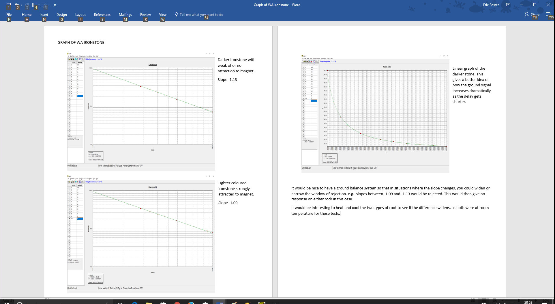 Those results were from two whole rocks. There is a lot more that could be done, such as plotting graphs for each specimen to see if there was a consistent difference between the two groups. The starting amplitude was set at 1000 arbitrary units at 10uS delay for both rocks by adjusting the gain of the test instrument.
