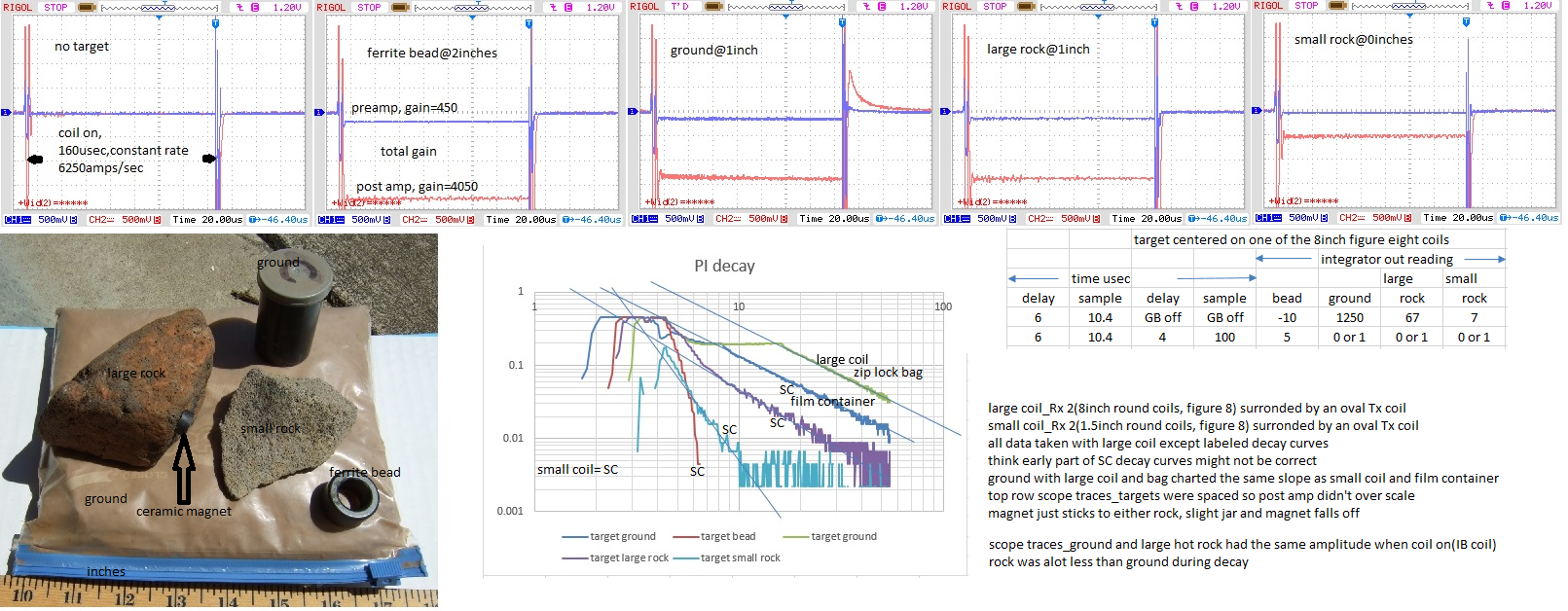 Glad to see you doing some rock testing. I have some ground and 2 hot rocks from California. Sometime the rocks cancel with the same settings as ground, sometimes a small change. Did some tests to see what I could learn when I saw you were going to test some rocks. The rocks have a lot more X than R signal compared to ground. Is that typical? Charted some decay curves, ground with film container and small coil charted the same slope as ground in bag with large coil. Had to use small coil and post amp to get enough signal to chart the rocks. They charted a steeper slope than ground but when I charted integrator out signal change with the large coil, the rocks cancelled the same as ground. Tried with 5.6, 6, and 7usec first delay. Ground and rocks cancelled at 6 and 7usec delay. Large rock had about 4 counts when ground cancelled at 5.6usec delay. I can disable target sample or ground sample with the bench detector. Disabling target sample, integrator out reads the same change opposite polarity as target sample so the integrator seems to be working. The faster slopes I'm getting with the small coil don't make sense. The 1.5inch coil is to small to insert the rocks. Any ideas why I'm charting steeper slopes? Maybe something to try. I've read ground from different locations have a similar decay slope, ground from California and my backyard are close. Would you expect hot rocks to have a large or small slope difference? Are your hot rocks easily detectable with your detectors after ground balancing?Originally posted by Ferric Toes View PostHi Green,