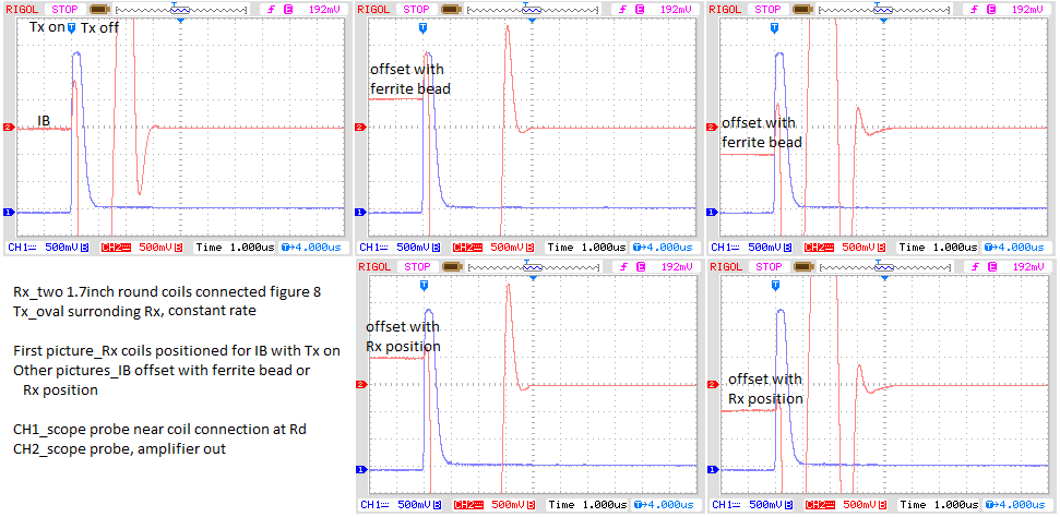 When I recorded the imbalance caused with the ferrite core reply#47 I recorded imbalance caused by offsetting the Rx coils for the same imbalance during Tx on with constant rate(about 3600A/sec). The signal for the two methods during Tx off looked the same. Thought this might mean something, not sure what.