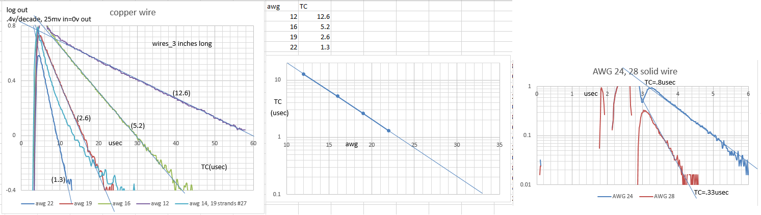 Finally got some charts for the AWG24 and 28 solid wire. Used 16 pieces 1inch long for AWG24 and 64 pieces 1inch long for AWG28(pieces laying flat not bundled). Added the TC lines from the projected chart, .8usec for AWG24 and .33usec for AWG28. Looks close. Had a hard time getting enough signal at amplifier out. Log amp not fast enough, charted amplifier out(target-no target)with Excel.