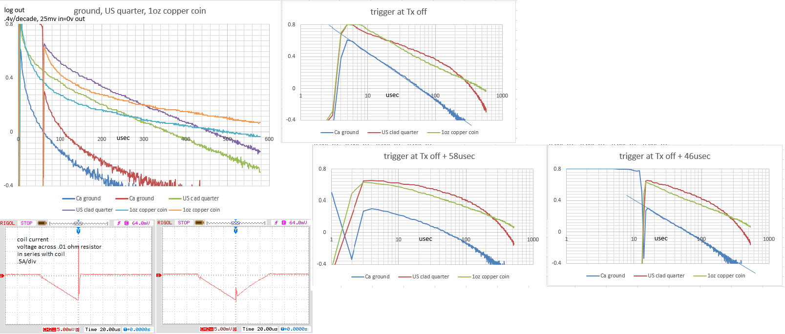 Thanks for the reply, think I'm starting to figure it out. Still working on a coil for 1usec delay. Attempted to chart signal decay with fast decay and decay I think is similar to the impulse. Wondering if it makes sense. Target distance was adjusted to give a near full scale signal for fast decay with coins and foil(couldn't get full scale with ground). I'll have to try a full bridge circuit.