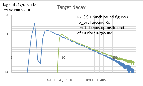 Playing with minimum delay again. Trying to understand why ferrite beads cause a signal at low delays. Hadn't noticed a signal at longer delays until his morning. Charted signal decay for California ground and some ferrite beads in a plastic bag. To get a positive signal decaying to zero, beads needed to be added to the opposite Rx coil as ground and all other targets I've tried. Both charted a similar log-log decay. Tried a large ferrite bead, decay similar to the bag of smaller beads(orientation seemed to effect decay slope). Why do ferrite beads have a signal and decay with opposite polarity of other targets after Tx off? Slope change below 0v could be measurement error or not.