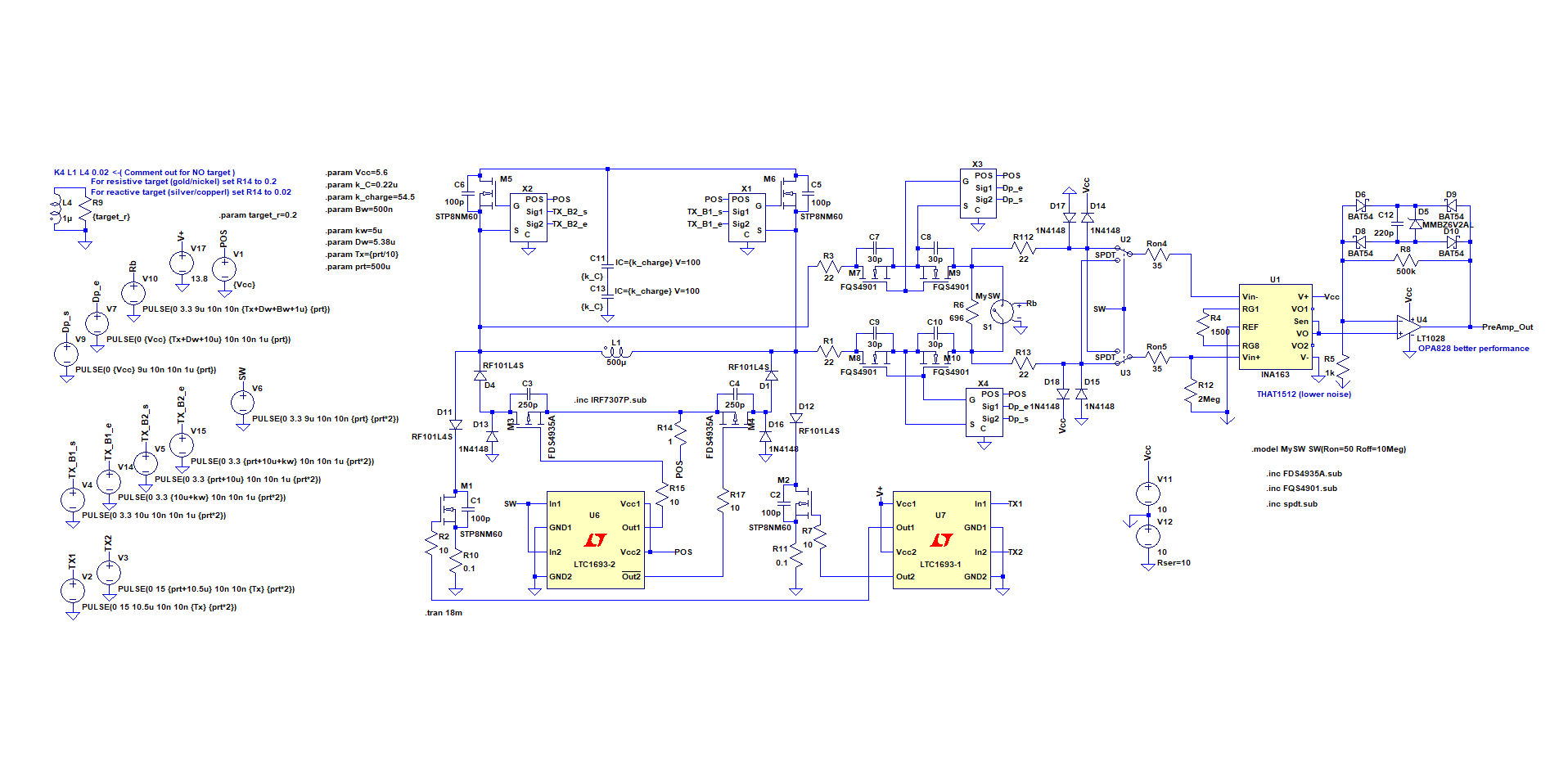 I have been working on a new bi-polar boost TX and front end for about the last 9 months that can work with both mono and IB coils. My intent is for use with an FPGA to provide all timing signals and post processing of the pre-amp output. The deign was inspired by Dave J's US Patent US9366778 and some observations I made during the study of the VMH3CS methods and technologies. I am now satisfied with the behavior under LtSpice simulation and now am in the process of implementing the design in Kicad. Actually, I had the Kicad design and layout completed, but made some last minute changes that changed about 10% of the implementation. The "New Bipolar Boost.zip" file should include all of the needed files to run the LtSpice simulation of the "mono" mode. If LtSpice complains about any missing components, let me know and I will supply them.