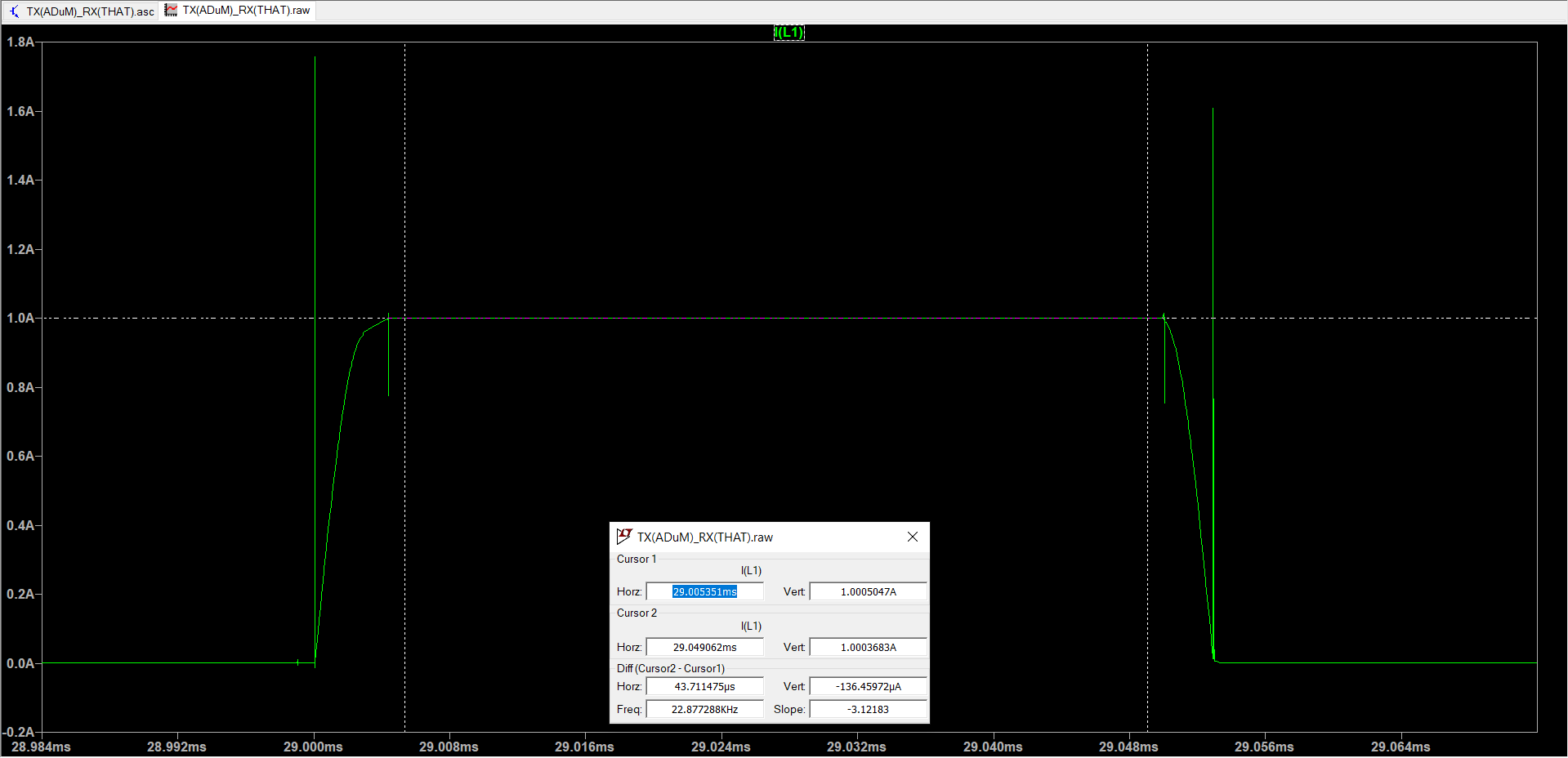 For example, the TX(ADuM)_RX(THAT) simulation as was delivered in the last zip and : R14=1.55, Vcc=5.026, kw=4.32u, dw=2.87u, and the ".option Gmin=1e-010" commented (using the Control Panel Spice default of 1e-012) results in the following waveform taken at around the 29 ms mark.