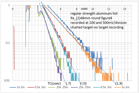 What I tried so far. Didn't get a usable signal with two mono coils or the 8inch figure8 Rx. Got a usable signal with 48mm figure8. Decay looks good but doesn't make sense. Including a chart. Tried to find aluminum thickness for a space blanket to calculate what TC should be without success. Just replied to show I tried, will try again. Might need to change something to measure a TC less than .8us.