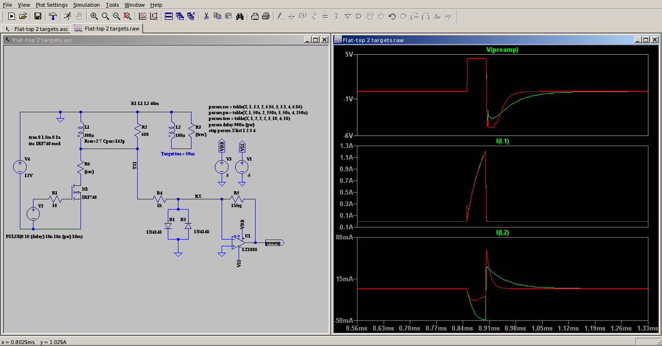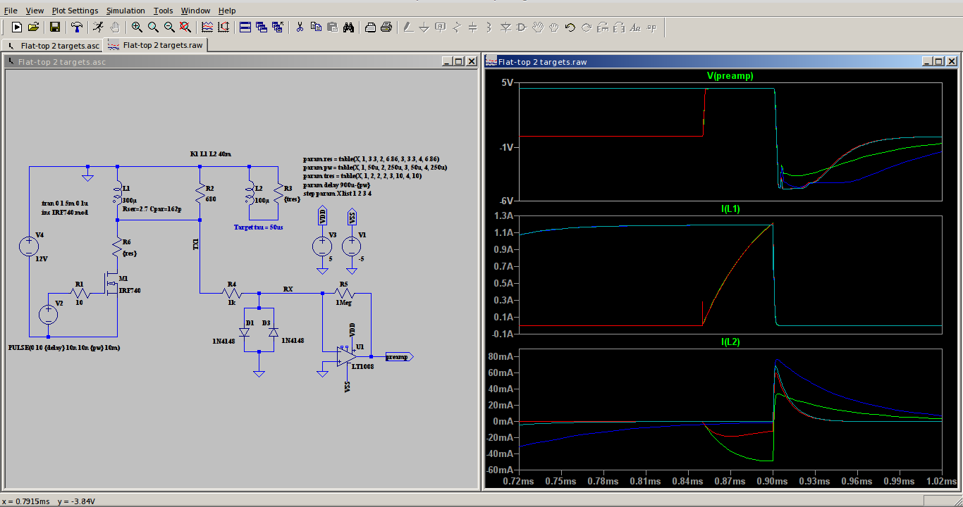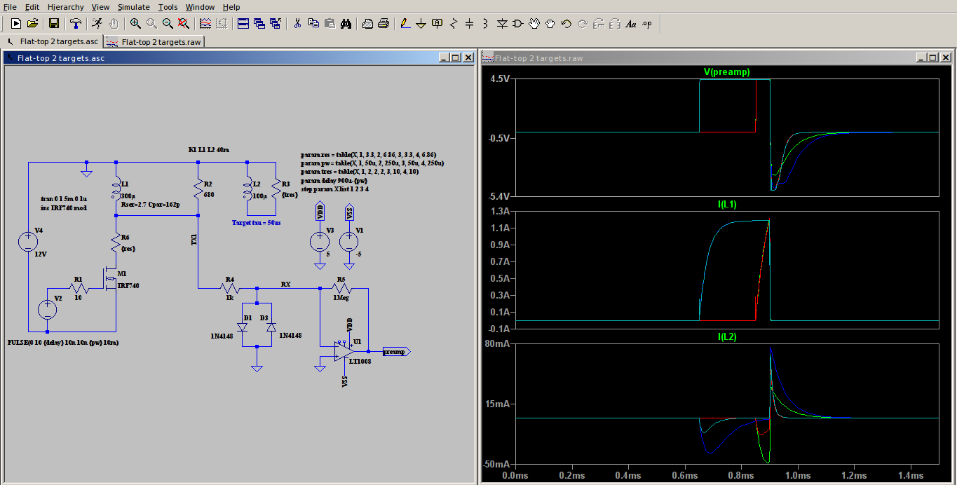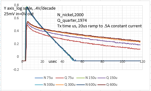 Nickels have a higher "impedance" than quarters so you would expect the initial eddy current to be lower, and thus the initial reverse field to be lower. But all this assumes a starting eddy current of zero at the TX step. If the TX pulse is not wide enough, then targets will have a reverse eddy current flowing at the TX turn-off step and this directly subtracts from the t=0+ forward eddy. High tau targets require a much wider TX pulse to kill the reverse eddies so for a given TX pulse width you should see a progressively lower starting RX voltage for progressively higher taus.