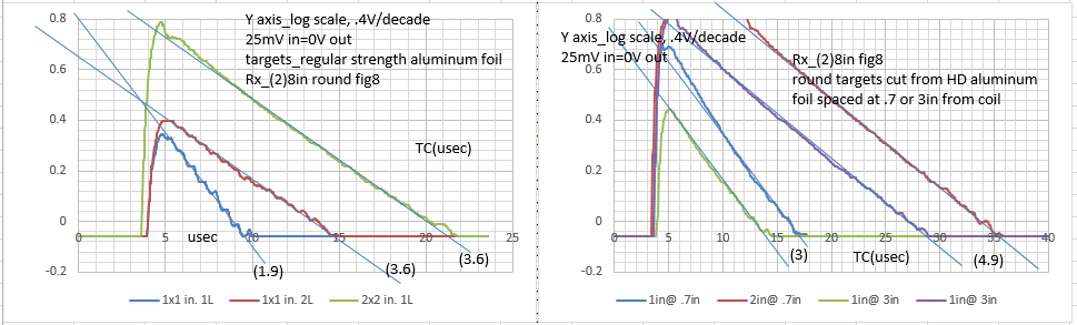I'm gonna offer a different explanation. Suppose that the TX pulse width is wide enough that the coil current has flat-topped and target reverse eddies have decayed to zero. The TX current then steps to zero, and this step induces a step EMF in the target. The induced EMF is the same regardless of the target (EMF = -dPHI/dt). The EMF produces an eddy current i = EMF/Z (where Z is the "impedance" of the target, which is a combination of metal conductivity, skin depth, and size/shape) and the eddy current produces the reverse magnetic field sensed by the coil as another EMF (the voltage you see with the scope).