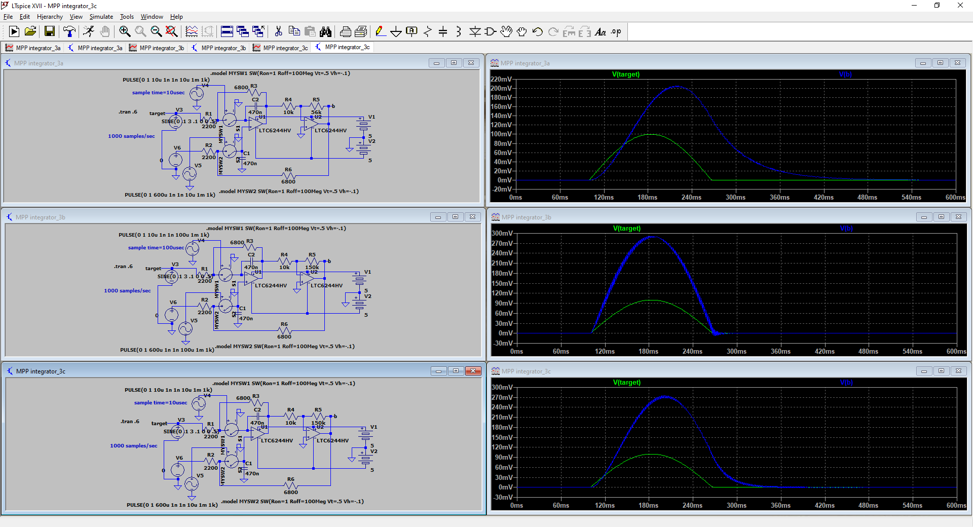 Some spice sims for MPP and 1C integrator, think they make sense. Sample time for 1C integrator changes gain not response. Sample time for MPP integrator effects response, not much gain effect. Changing R5 MPP integrator effects response, not much gain effect.