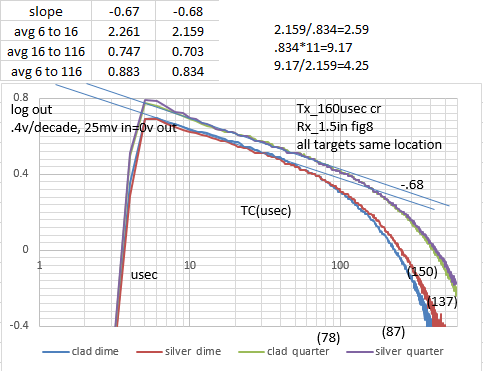 Used Excel to integrate a signal similar to a quarter. Quarter decays straight line log-log to about 100us. Generated a decay with -.68 slope and calculated the average for a 10us sample(6 to 16us) and a 110us sample(6 to 110us). Average for 10us sample=2.159. Average for 110us sample=.834. With a 1C integrator the gain for the 110us sample is 11 times the 10us sample, .834*11=9.17 . The longer sample is 9.17/2.159=4.25 the shorter sample, close to the 4 times I got with my real data calculation.Attached Files