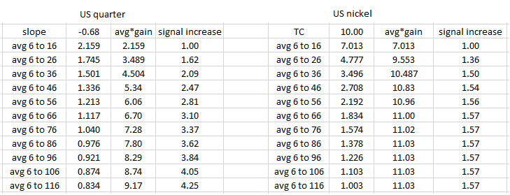 Charted the quarter and a nickel(TC=10us) with Excel(decay signals generated in Excel). 10, 20, 30, 40, 50, 60, 70, 80, 90, 100 and 110us sample time starting after 6us delay. Wondering if there is an increase in sample time with the quarter where S/N decreases. Thinking S/N decreases after 30us sample with the nickel. My bench circuit isn't working, wondering if anyone has tried increasing sample time and seen S/N decreasing.Attached Files