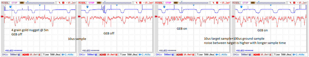 In use I found that a GEB sample time of 90-120usec works best to remove ground response and maximize response to high conductors (silver Quarter, etc). Also have increased the TX pulse time to 180usec to further increase the response of high conductors.