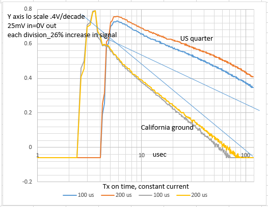 For ground signal only, subtract ground sample from target sample to ground balance(make them equal before subtracting). Has anyone one done S/N comparison between short = time sampling(increase ground sample gain before subtracting)vs increasing ground sample time before subtracting with an integrator? Including a chart with ground and US quarter. Ground sample taken at 20us is about 6.8 divisions less than target and ground sample at 6us. Need to increase ground sample 4.8 times before subtracting(Gain=1.26 raised to the 6.8 power). Target sample at 20us would increase 6.8 divisions also. Three divisions greater than 6us sample(1.26 raised to the third power, 2 times the signal opposite polarity). Two times the signal but almost 5 times the noise=loss in detection depth. I've done ground balance by increasing ground sample time so ground sample signal=target sample signal with ground signal only. Integrator gain=((R feedback/R in)*sample time*sample rate). Increasing ground sample time increases integrator gain. Maybe signal amplitude, increases noise signal but not proportional to gain increase. Increase noise means less target detection distance.