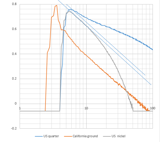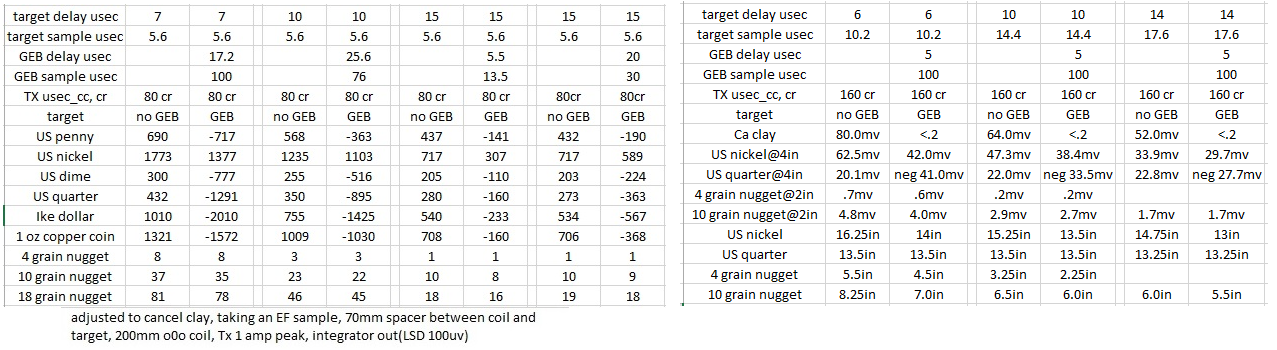 Wrong for GB on signal. Signal amplitude is 2 times higher than GB off signal but GB on signal is(target sample - ground signal)so GB on signal same amplitude as GB off signal opposite polarity. Another chart including ground, US nickel and US quarter. Think the nickel GB on signal would be about 30% of GB off signal. Thinking averaging with an integrator might be better. Maybe I'm looking at it wrong. Anyone have a thought?
