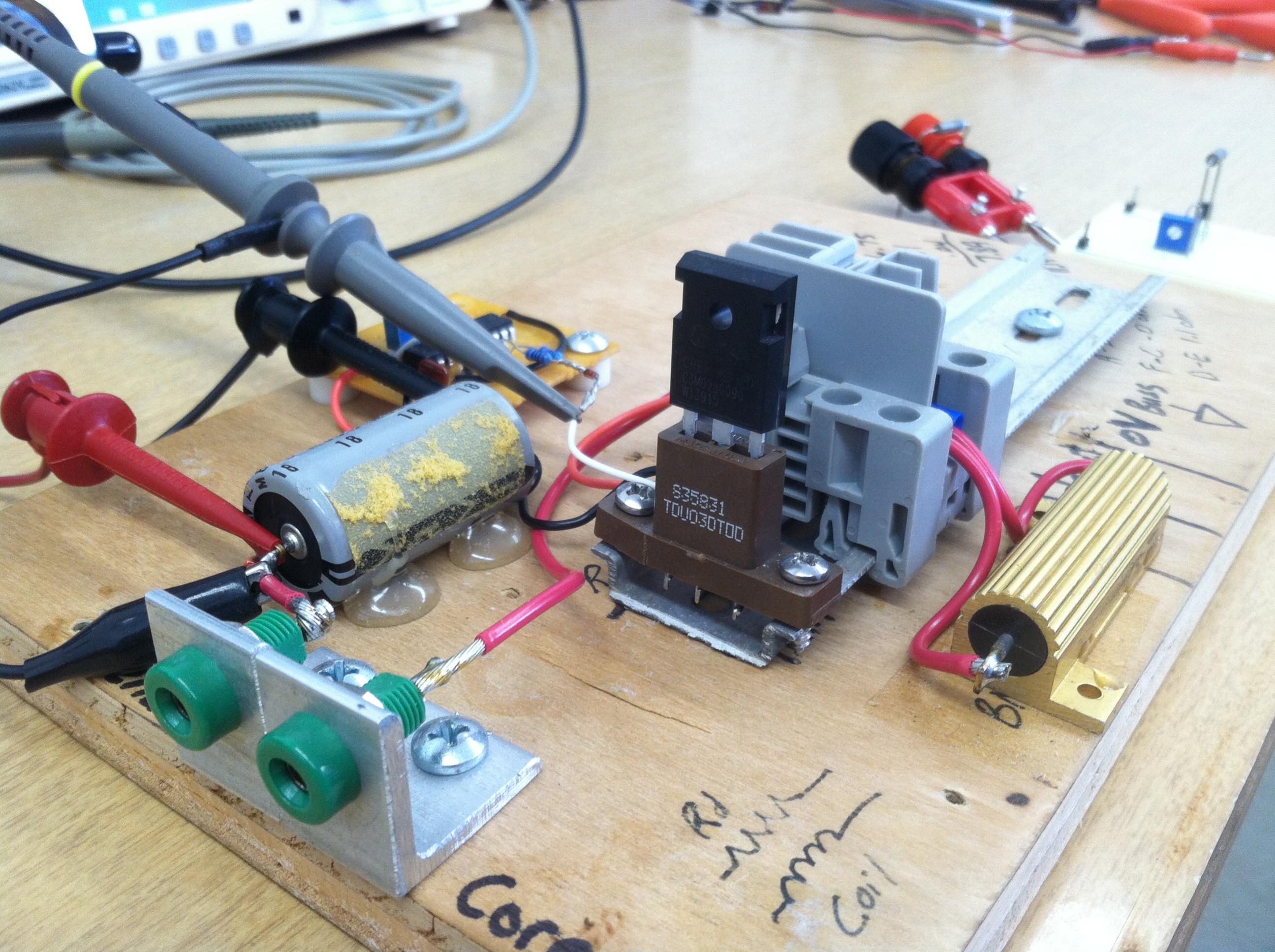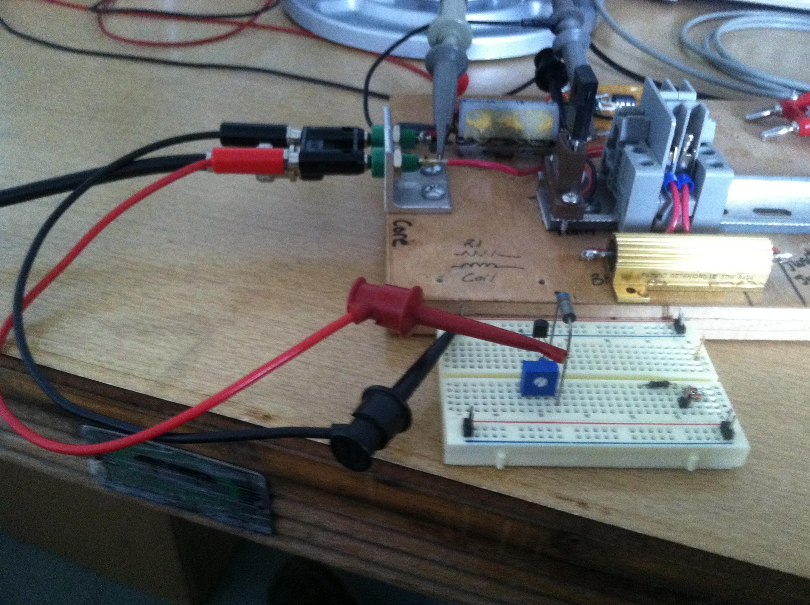I put together a circuit idea I had for an active damping circuit, and tested it this morning. I'm going to post pictures over a few posts' so I can describe what is happening. The setup is on my test fixture 12 volts. 150uS Tx Width. 3kHz Frequency thereabouts. 400uH Coil, 2R Coil Resistance. 10R Series Resistance. Cree SiC Nch Mosfet 900V. I have banana jacks on the fixture,with a bnc adapter,most of my coils use bnc. There is an adapter with binding posts' with a 680R resistor mounted for the standard config of 680R across the coil.There is no parallel 1K ohm and inverse parallel diodes in this test. The test circuit is built on the breadboard,and wired to the bnc adapter. The test circuit is an scr MCR22-6 1.5 ampere rms rating with very high 150 ampere for 2uS rating. 1N914 diode connected to the gate,1K resistor,and 100K trim pot in series with the resistor to control gate current and thus turn on delay.680R Resistor in series with the anode,cathode connected to 0V. The circuit allows the flyback to rise to a high voltage of your choosing adjustable with the trimpot. When the scr fires it connects the coil to 0V through the 680R damping resistor and latches until...? Dont know,dont care,it will certainly turn off on the next Tx which will reverse bias it. It also blocks current in the damping resistor during Tx,so you get more bang for your buck there also. 680R not critical value I tried several and this is the highest value that will damp the coil,there are probably gains to be had by trying different values,and scr firing delays to get it down to 0V the fastest. I am seeing critically damped flyback in under 5uS.