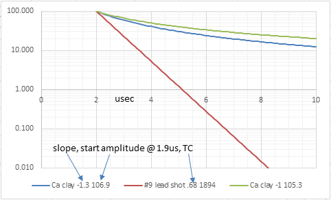 Been thinking what I would need to change to detect #9 shot with a 8inch coil. Charted decay curve for #9 shot(TC=.68us) and ground with a -1 and -1.3 decay slope. Now I'm wondering what would be the best timings to GB.